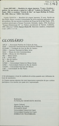 Catálogo da exposição "1ª Exposição Internacional - Esculturas Efêmeras", realizada na Fundação Demócrito Rocha - Fortaleza/ CE. O documento apresenta informações de todos os artistas participantes, incluindo algumas de suas exposições mais importantes.