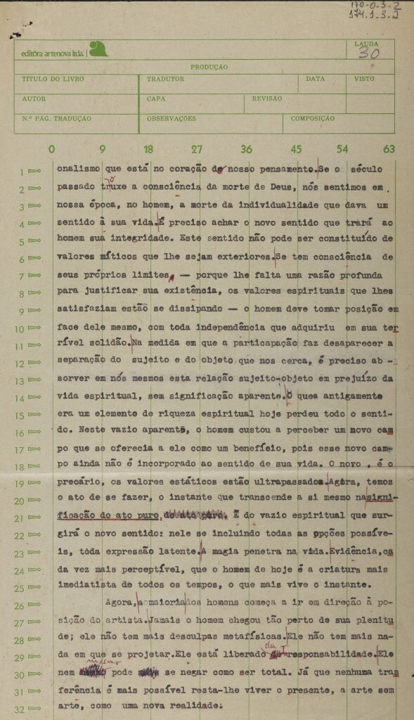 Texto escrito por Lygia Clark sobre a modernidade, o homem moderno, valores, posicionamento, vazio e o sentido da vida.