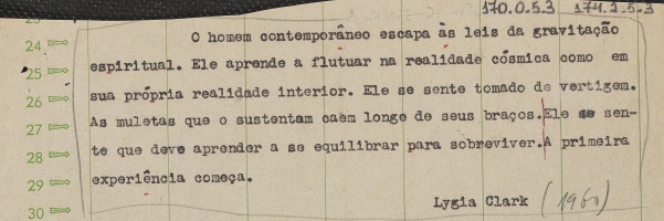 Texto de Lygia Clack sobre uma concepção criada pelo homem para atender suas necessidades de equilibrio, onde ocorre um conceito racional e falso da realidade, fazendo com que o homem se desvincule dele e encontre um novo recomeço.