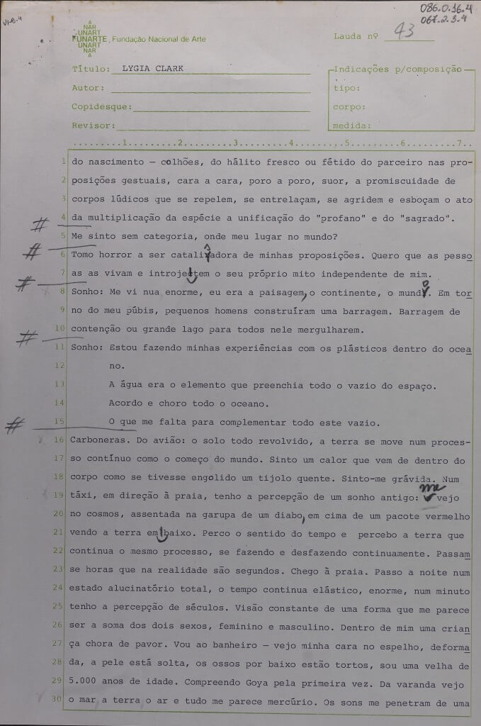 Reprodução de artigo escrito por Lygia Clark sobre o pensamento mudo realizada pela Funarte.