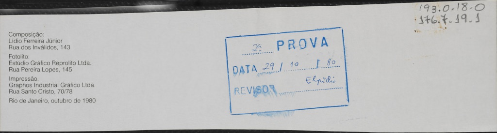 Material coletado para o livro da FUNARTE: nome e endereço dos indivíduos encarregados da composição, fotolito e impressão da obra.