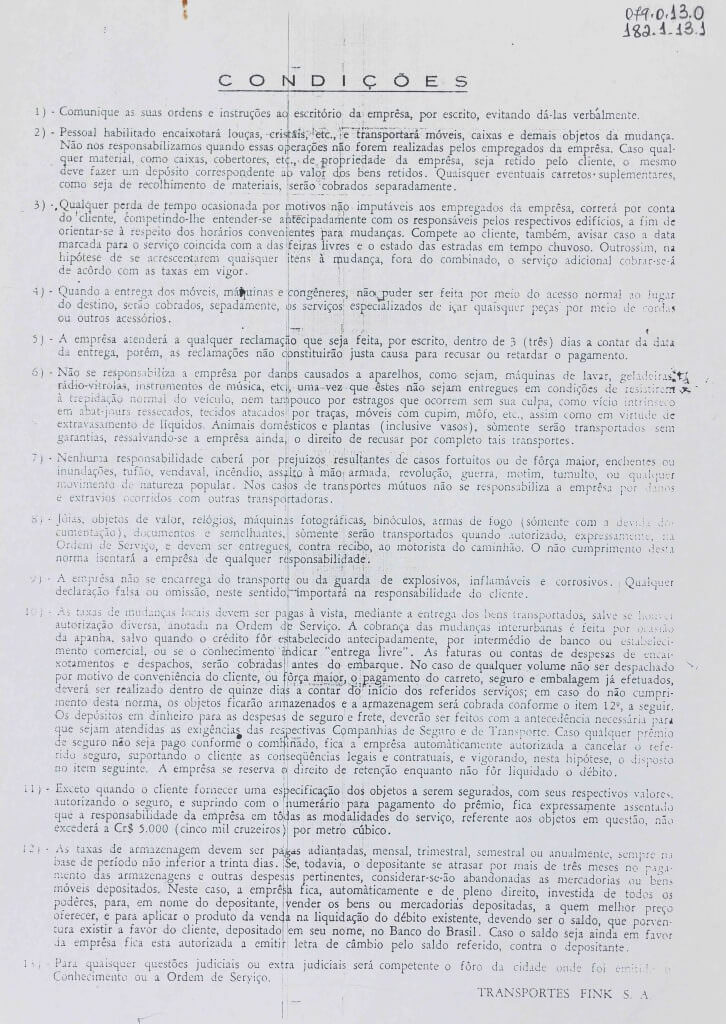 Lista de "condições" expressas pela tranportadora Fink a seus clientes.