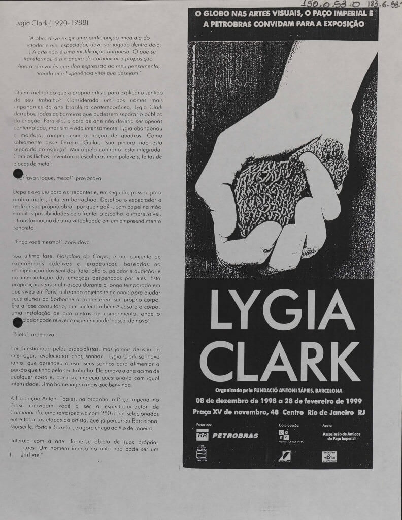 Catálogo sobre a exposição "Lygia Clark", organizado pela Fundació Antoni Tàpies no Rio de Janeiro entre 08/12/1998 e 28/02/1999.