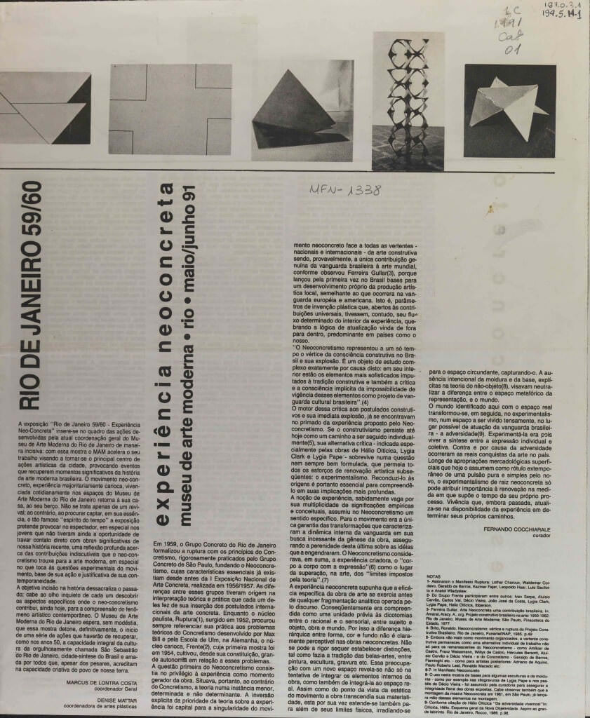 Catálogo da exposição "Rio de Janeiro 59/60 - Experiência Neo-Concreta" realizada no Museu de Arte Moderna do Rio de Janeiro (MAM/ RJ) no período de maio e junho de 1991 e contou com obras de Lygia Clark.