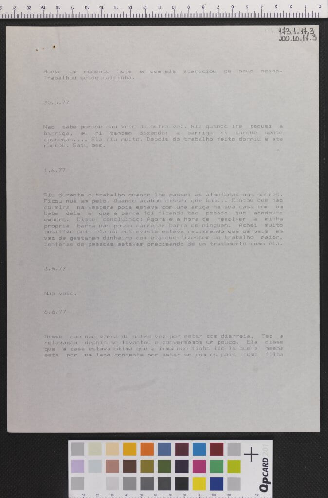 os documentos dizem respeito a um diário de um caso clínico em que Lygia Clark anota as experiências de uma análise realizada com uma moça de 18 anos.