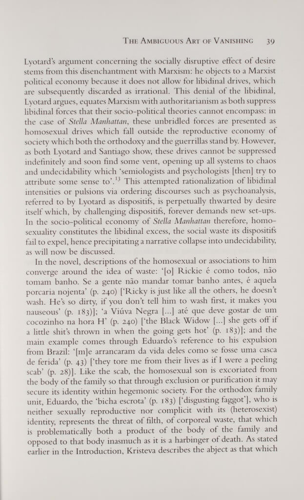 O livro analisa as obras dos escriores Silvano Santiago e Caio Fernando Abreu, pensando os modos como elas exploram as subjetividades de homens homossexuais por meio dos conceitos de deslocamento, exílio e abjeto.