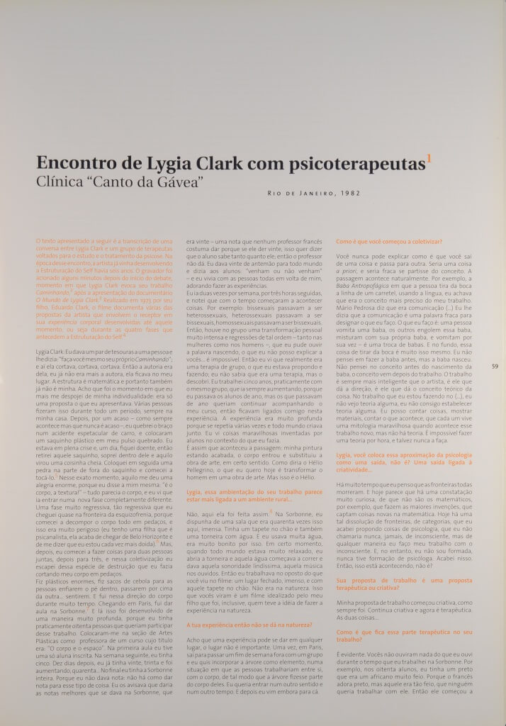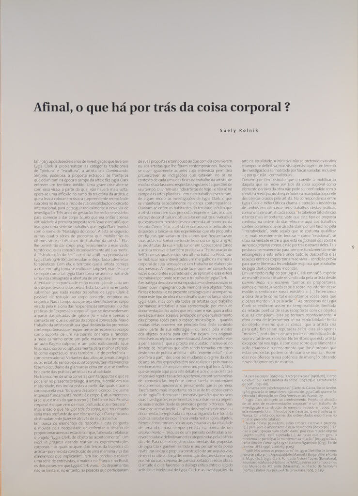 ROLNIK, Suely; DISERENS, Corine. (Orgs.). Lygia Clark. Da obra ao acontecimento. Nantes, França; São Paulo: Musée des Beaux-Arts de Nantes; Pinacoteca do Estado de São Paulo: 2006. Catálogo.