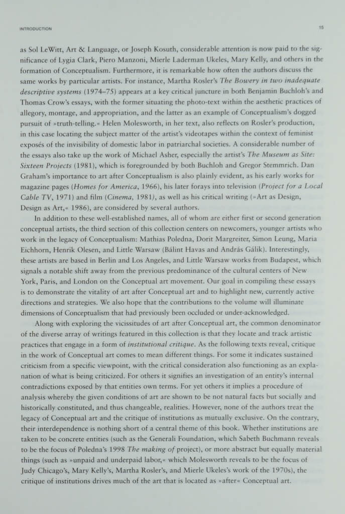 ALBERRO, Alexandre. Introducion: The Way Out is the Way in. In: ALBERRO, Alexandre; BUCHMANN, Sabeth. Art After Conceptual Art. Cambridge, MA: MIT Press, 2006. p. 13-25. ISBN: 0262511959
