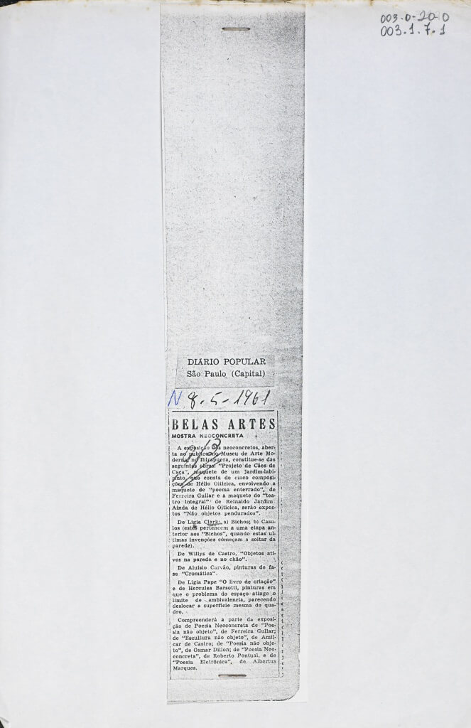 Nota informativa no Diário Popular em 8 de agosto de 1961 sobre "3ª Exposição de Arte Neoconcreta" realizada no Museu de Arte Moderna de São Paulo em 1961.