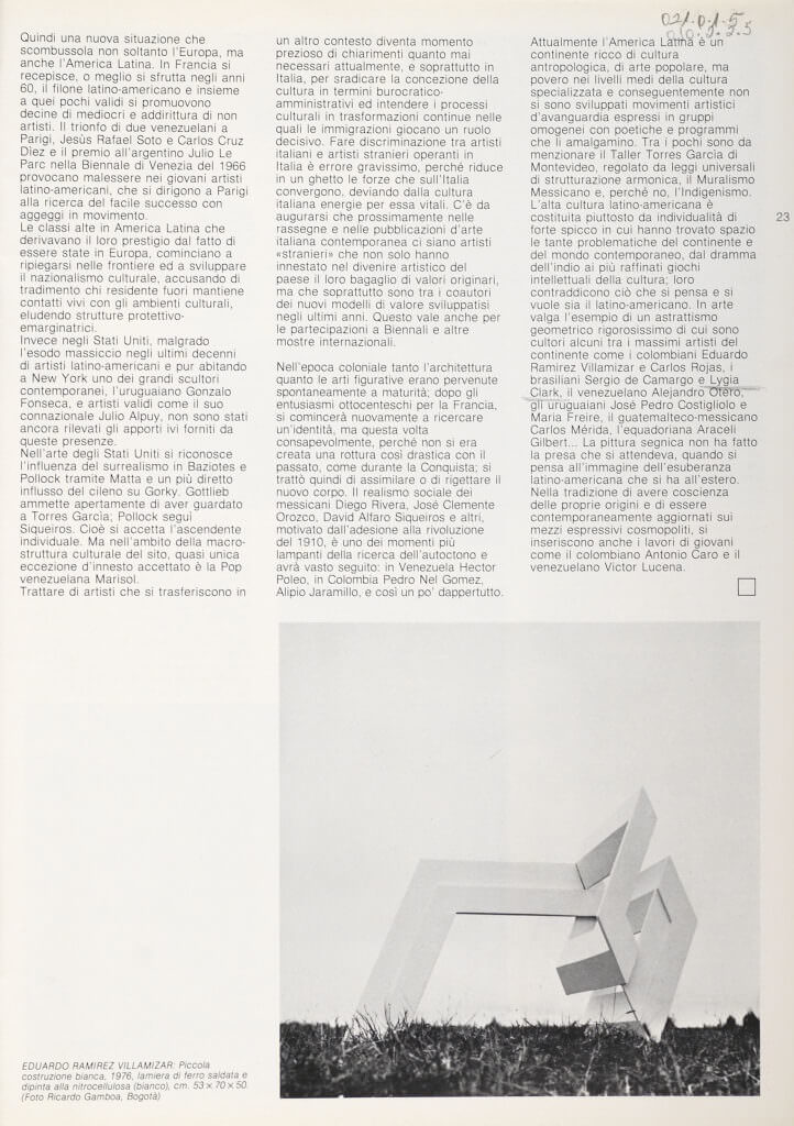 O texto trata da arte feita na América Latina, comparando com a feita na Europa e Estados Unidos, citando artistas importantes de cada país, inclusive Lygia Clark.