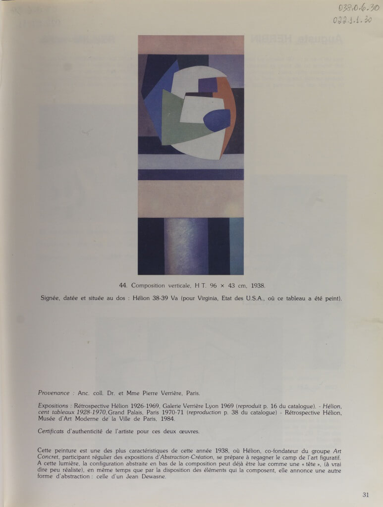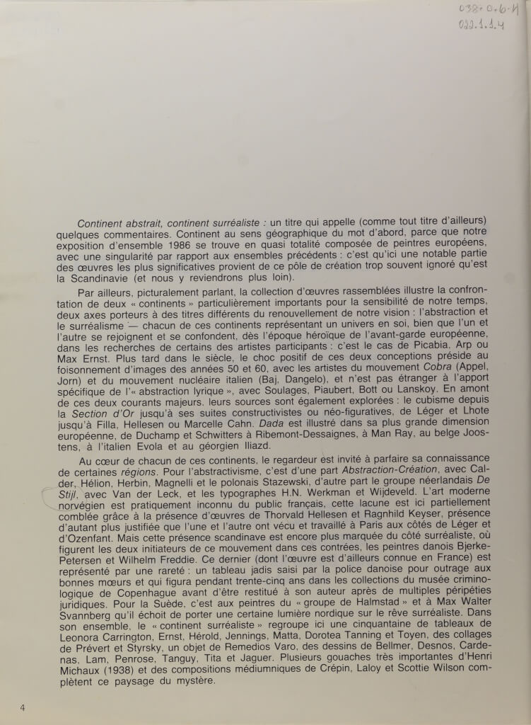 Catálogo da exposição “Continent Abstrait, Continent Surréaliste”, ocorrida durante o período de 18 de fevereiro a 30 de março de 1986, na Galerie 1900-2000, Paris.