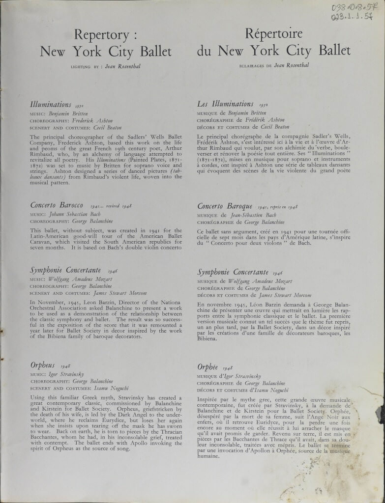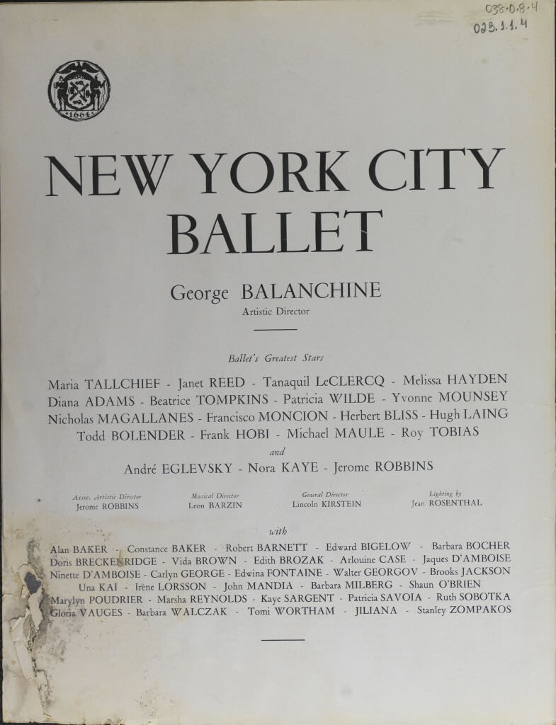 Documento de leitura pessoal de Lygia Clark, revista The New York City Ballet, de 1952, sobre a companhia de ballet da cidade de Nova York, a qual fornece informações sobre às apresentações do ano de 1952.