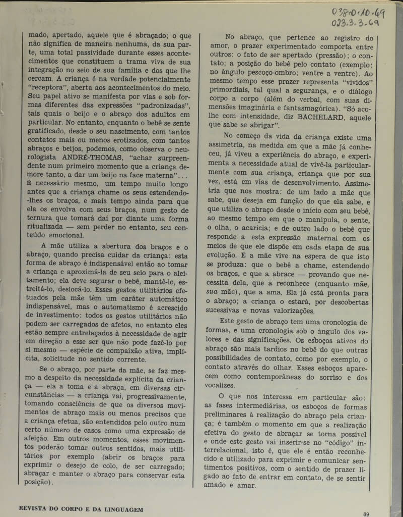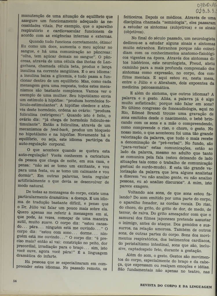 Documento de leitura pessoal de Lygia Clark, revista "Do corpo e da Linguagem", com publicação dos anais do Primeiro Congresso Internacional sobre o Corpo: Universo do Corpo, realizado no Rio de Janeiro, novembro de1985.vol.IV,nº11.