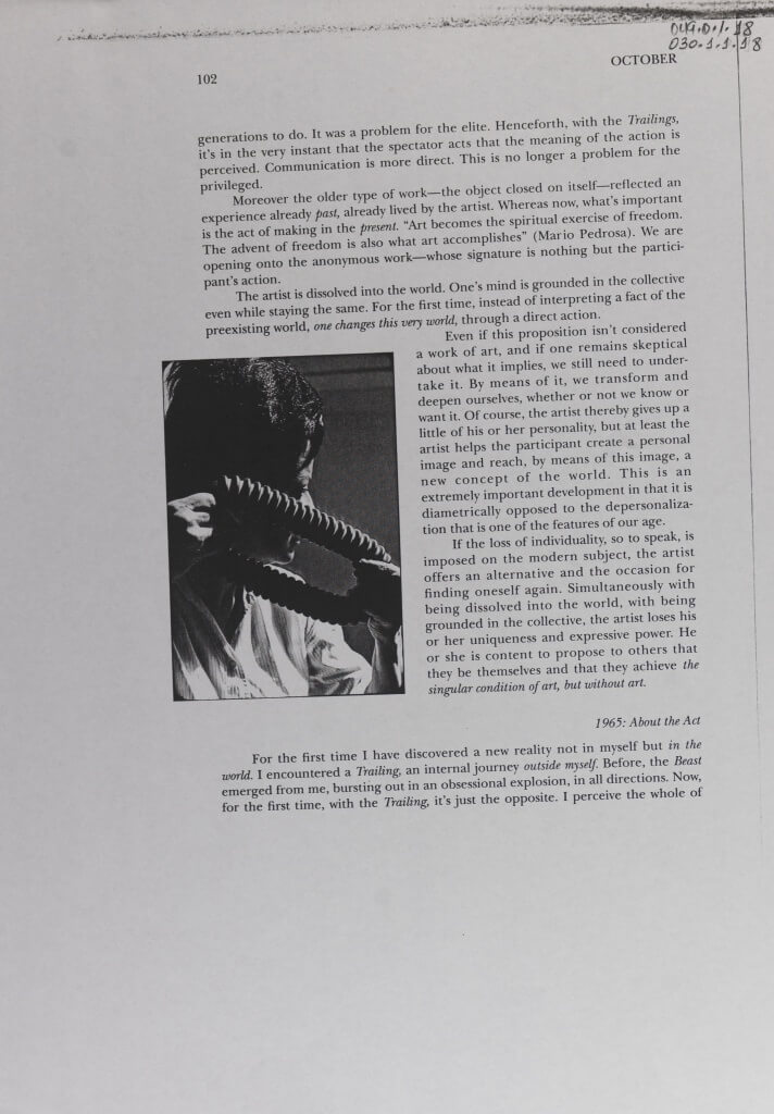 Artigo crítico de Yve-alain Bois para o Periódico October 69, sobre a vida e carreira artistica de Lygia Clark. O qual faz um apanhado de várias obras da mesma.