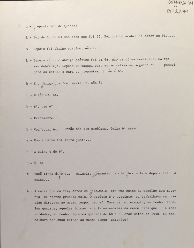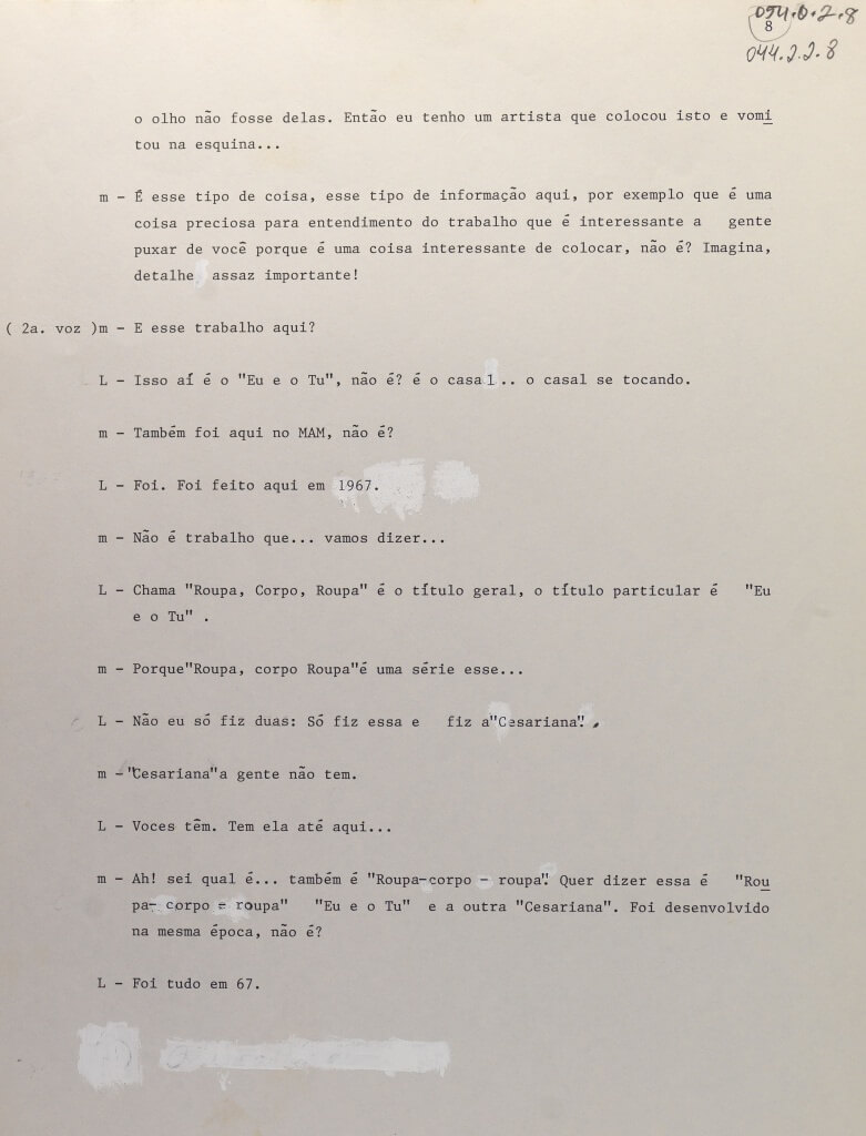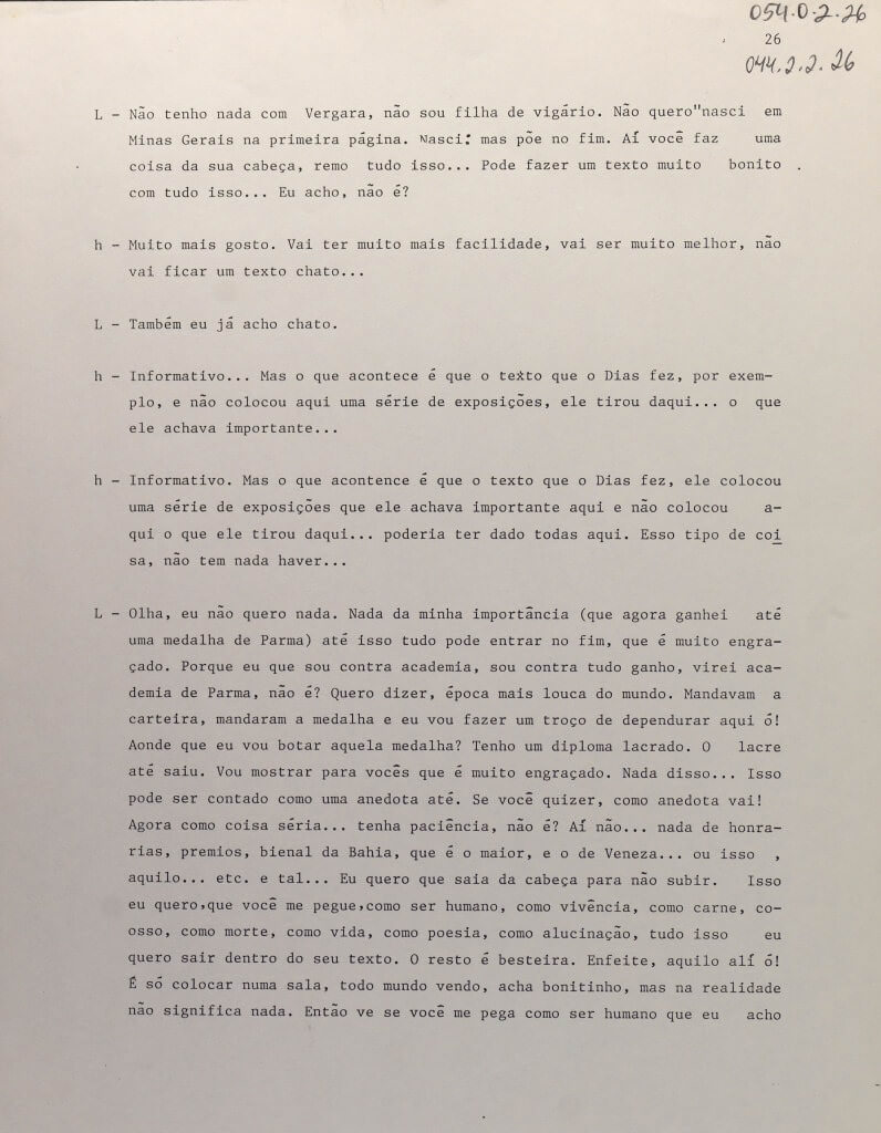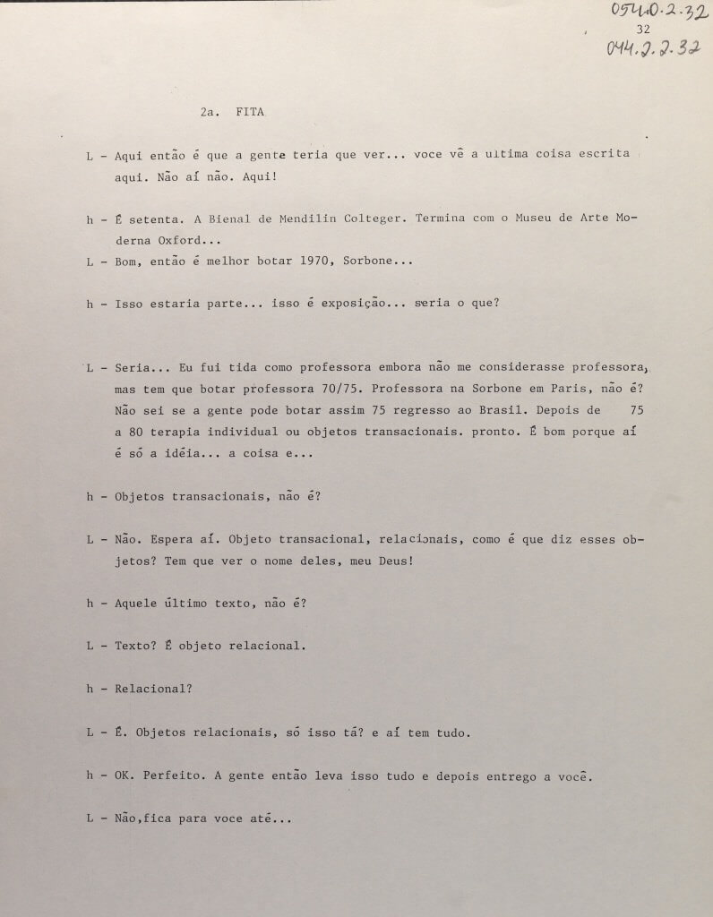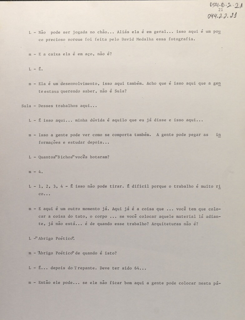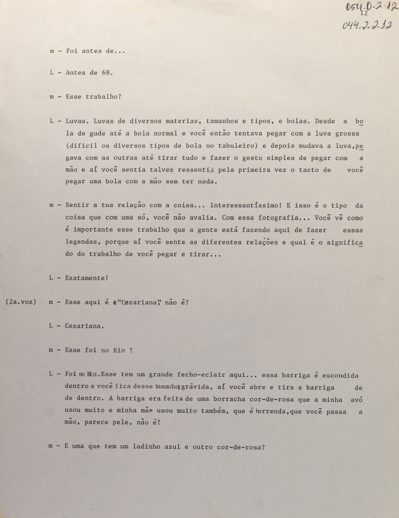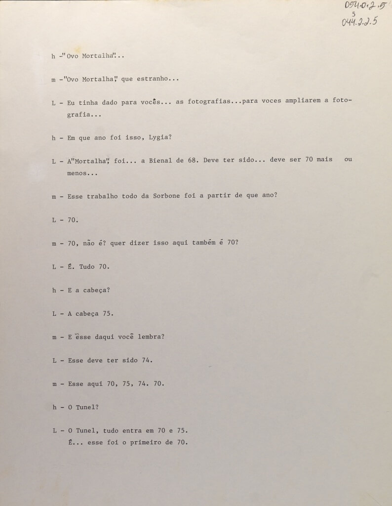 Transcrição de uma entrevista gravada com Lygia Clark, a qual a mesma expoe sobre suas obras e proposições, os métodos utilizados e sua visão para o sentido de cada uma. Essa entrevista foi gravada em 1980, para escolha do titulo de seu livro, produzido pela FUNARTE.
