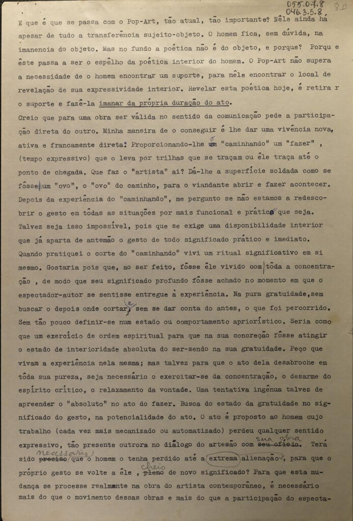 Documento em que consta de uma das primeiras anotações para a produção do Livro Obra, em que Lygia Clark teoriza a respeito dos seus objetos de arte, além de contar com uma demonstração prática de como eles forma concebidos.