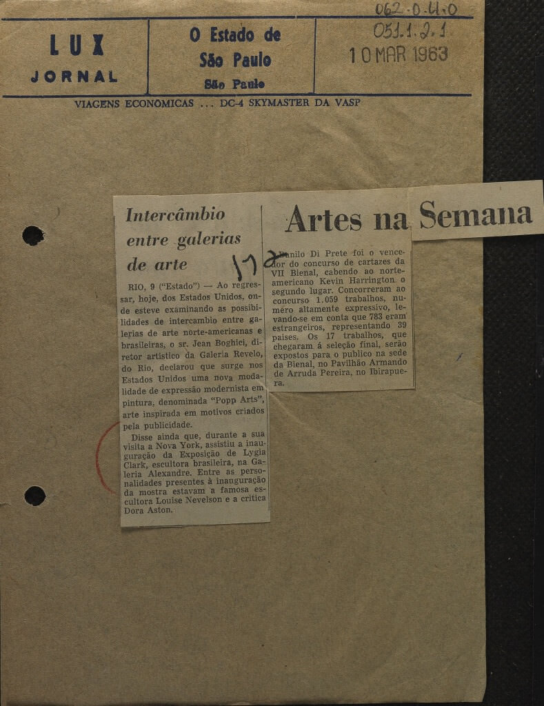 Nota no Jornal O Estado de São Paulo, São Paulo, em 10.03.1963, o qual consta uma referecia da exposição realizada na Galeria Alexander em Nova York por Lygia Clark, e ressalta a presença da escultora Louise Nevelson e a crítica Dora Aston na inauguração.