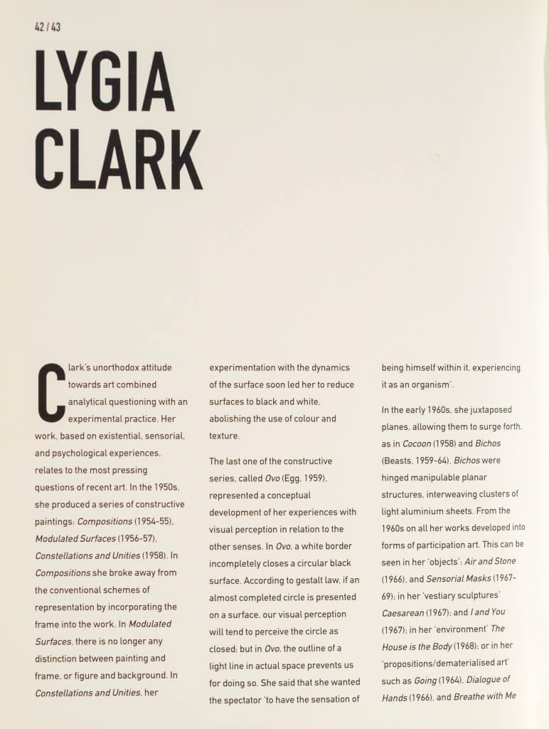 Catálogo da exposição Experiment Experiencia Art in Brazil 1958-2000, organizada pelo Museum of Modern Art Oxford, sobre a arte brasileira a partir de 1958 até os dias atuais. No catálogo estão relevos geométricos de Lygia Clark, além de imagens consta ainda no catálogo texto sobre suas obras e uma breve biografia.