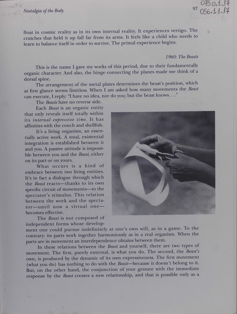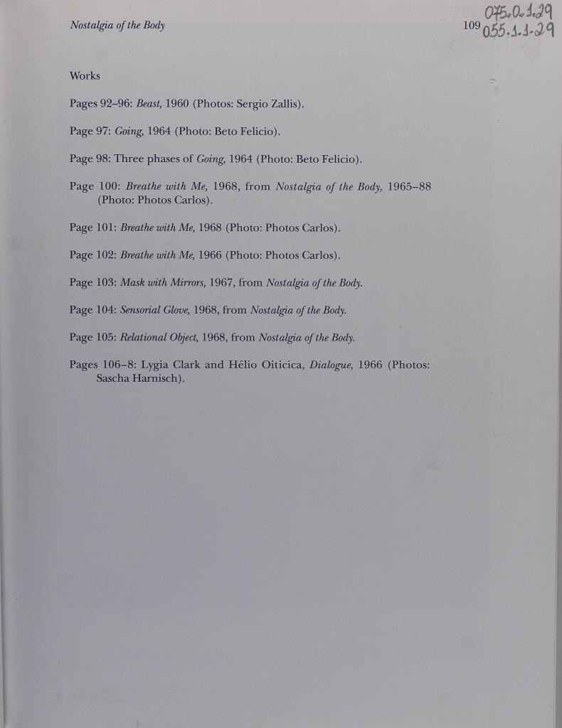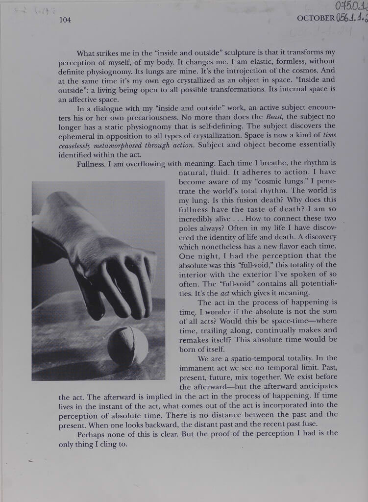 Revista October, de 1994, em que consta uma matéria a respeito da produção de Lygia Clark no período de 1960 a 1968. A introdução é feita por Yve-Alain Bois onde este apresenta algumas memórias de sua interação com a artista e principalmente com alguns dos objetos sensoriais. A publicação conta também com textos de autoria da própria Lygia Clark e textos em autoria compartilhada como o Manifesto Neoconcreto.