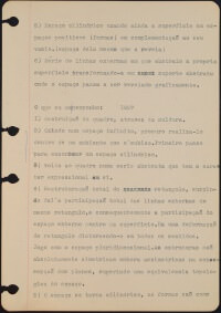 3) 1956- Respeito o plano e a linha começa a delimitar os planos formais e cromáticos. Nesta fase pois, a linha começa a funcionar como espaço-limite de planos espaciais. A cor começa a sugerir a forma e sua complementação (positivo-negativo). Não no sentido de fundo figura. Uso o preto, o branco e o cinza, branco puro branco amarelo etc.