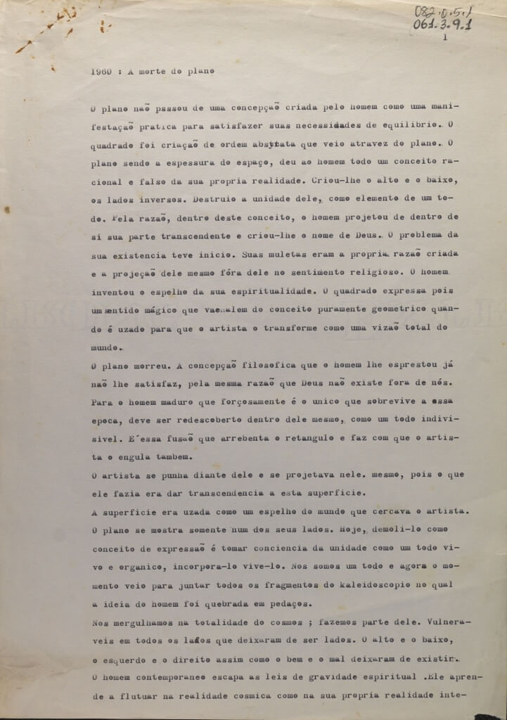 Texto escrito por Lygia Clark sobre a superficiliadade do plano, que seria apenas um conceito criado pela homem em vista de sua necessidade de equilíbrio. Deste modo, a artista aponta sua atitude de destruí-lo em sua unidade para depois alcançá-lo e vivenciá-lo como totalidade.