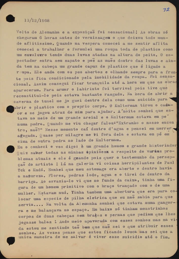 Eu o conheci e vos digo: è um grande homem e grande historiador. Quiz saber todas as minhas opiniões a respeito de varios problemas atuais e ele é grande pois quer o testemunho da persepçaõ do artista ! Lá na galeria vi coisas horripilantes de Paul Tck e Kudó. Sonhei que meu estomago era aberto e dentro havia a natureza. Flores, pedras lodo, agua e o tirei de dentro da barriga. Ao esvazia-lo vi que no fundo da caixa, tinha uma figura de um homem primitivo com o braço trançado com o de uma mulher. Estavam nus. Tinha tambem uma abertura que era para colocar uma especie de pilha eletrica que eu naõ sabia para que servia.... Na volta da Alemanha sonhei que estava numa gangorra e me balançava no espaço. Em baixo só tinham monstrinhos corpos de duas cabeças sem braços e pernas que pediam que lhes jogasse balas ! Ando meio apavorada com esses sonhos mas na vida estou me sentindo taõ bem que naõ sei o que atribuir esses sonhoe. As vezes penso que estou ficando louca mas sei que a unica maneira de me salvar é viver esse suicídio até o fim.