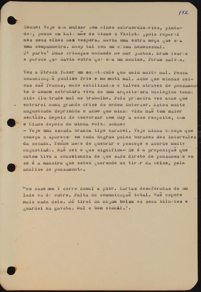 Crise muito aguda da falta de comunicaçaõ em Ultrech. Taõ aguda quanto a crise do o “caminhando” mas assim mesmo estou mais serena. Jean Clay vae comigo num hospital de psicoticos no Loir e talvez lá passa trabalhar com eles. Fico um pouco deprimida pois fugi da loucura toda minha vida e agora parece que o meu logar é lá mesmo.