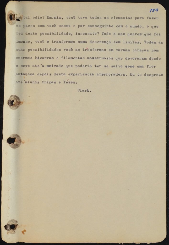 Si é verdade que eu fui um elemento de ligaçaõ entre voc^e e o mundo, você está sendo o elememto de desligamento entre eu e as coisas claras e vejo em. torno de você somente trevas...Trevas perigosas, insana treva onde medram monstros os mais repelentes. Isto vem vindo de longe e como nas historias biblicas as trevas acabaram por devorar a luz e se fez a escuridaõ total. Ésta, eu me recuso a partilhar com você. Eu sou o bicho que procura a verticalidade, embora as minhas raizes sejam a propria terra.Gosto do que é claro, limpido e otimista. Detesto esta esquizofrenia que só leva a destruiçaõ e ao sofrimento. Me sinto como uma estrutura que foi envolvida por amalgama incolor, gelatinosa que sugou tudo que havia [...] mim, como uma parasita maldita, grosseira, sem sutilezas no[...] e receber pois ela só sabe sentir a segunda parte e que planta resistiria a este amplexo mortal?...Me sinto esmagada, destruida, oprimida e gasta a um tal ponta, só comparavel a sensaçaõ de ter bolsos vazios...pois tudo me foi tirado, até a minha capacidade afetiva de dar “apesar de” e contra os sintomas adversos de qualquer tipo de afetividade. Você é um sujeito maldito. Disto eu estou certa e naõ ha nada a fazer. Para mim chega a minha propria maldiçaõ que é a das pessoas perfeccionistas que buscam sempre a elaboraçaõ atravez de um contacto afetivo. Naõ foi pois gratuita para mim esta experiencia pois atravez de você eu abri em novos enfolhos, procurei soltar as minhas aguas em ribeirinhos antes insuspeitados, conhecendo e provando o amargor das revelações dilaceralmente novas, opostas em polaridades, porem tentando sempre fundi-las no meu ser-sendo que sempre buscou novos encontros, até o momento dele se feixar enexoravelmente como uma ostra encouraçada, numa defesa terrivel contra a destruiçaõ que neste momento é eminente, fatal. Você, no seu terrivel egoscentrismo ficou você mesmo o antes imutavel, o que naõ se abre, o que tem pavor de se dar. O que foi gerado dentro deste corpanzil insensivel e nesta cabeça doentia foi um monstruoso desejo de maguar de matar, de torturar de dilacerar, pobre ser que naõ tem opçaõ que naõ desperta nem piedade, mas sim um odio terrivel de tal maneira que as minhas viceras estaõ enrodilhadas como uma cascavel, pronta para dar o bote fatal: eu te desligo do mundo atravez de minha pessoa, si é que fui realmente elemento neste sentido e te injeto de um um tal desprezo, que sinto minhas viceras engroladas numa ancia de vomito infinito, taõ intenso como se [..]vesse me alimentado de uma substancia ultra venenosa e execravel, que é preciso vomitar me virando pelo avesso para que eu sobreviva limpida e clara na minha integridade. Eu te devolvo a sua pseudo liberdade, pobre infeliz prisioneiro de si mesmo, te devolvo a sua rotina, pobre animal acuado num recesso inaxecivel, te devolvo tambem, sua pseudo-amizade, doença que só os ricos podem ter o privilegio de conserva-la. Ai de ti, monstro que nasceu de uma mulher sem entranhas que se abrem para receba-lo. Ai de ti monstro que odeia por isso mesmo todas as entranhas e tem horror as suas origens e se destroe nesta negaçaõ. Que misterio terrivel envolve um ser que por si mesmo tem tal complascencia e pelos outros um tal odio? Em mim, você teve todos os elementos para fazer as pazes com você mesmo e por conseguinte com o mundo, o que fez desta possibilidade, insensato? Todo o meu querer que foi imenso, você o transformou numa descrença sem limites. Todas as suas possibilidades você as transformou em varias cabeças com enormes borracas e filamentos monstruosos que devoraram desde o sexo até a amizade que poderia ter se salvo como uma flor autonoma depois desta experiencia aterroradora. Eu te desprezo até minhas tripas e fézes.