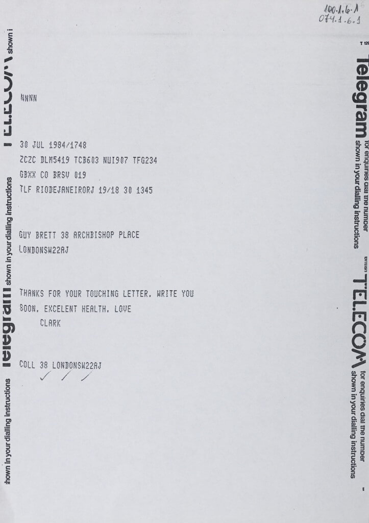 telegrama de Lygia Clark para Guy Brett agradecendo por uma carta anterior.