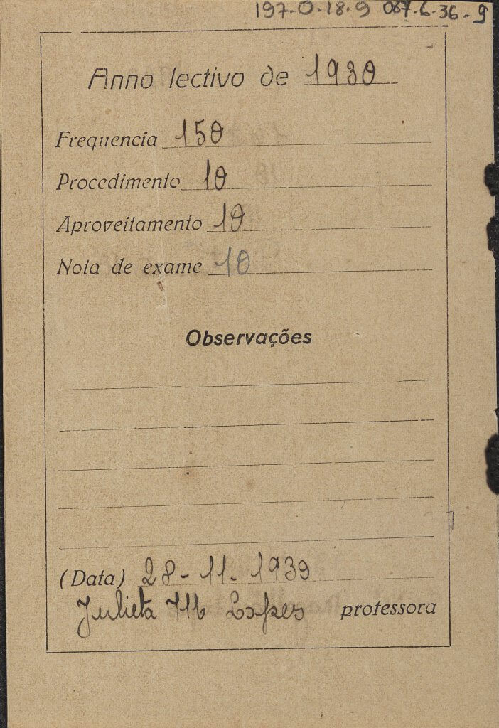 Caderneta Escolar de Lygia Clark, que estudava no Grupo Escolar Barão do Rio Branco em 1929 e tinha como professora Julieta Magalhães Lopes