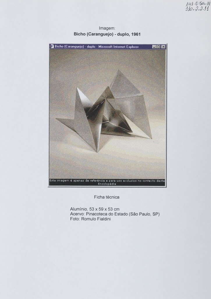 Pequeno relatório de pesquisa contendo histórico e trajetória de Lygia Clark com imagens. Autor desconhecido.