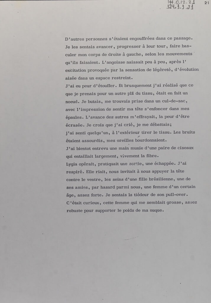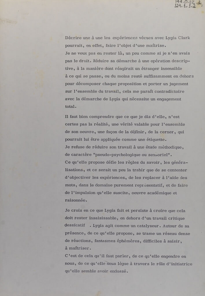 Texto crítico sobre a obra de Lygia Clark escrito por Gaelle Basser.