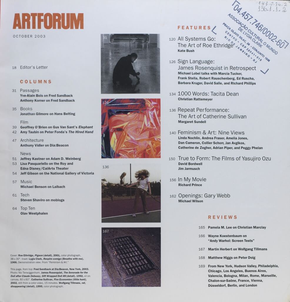 Revista Artforum internacional de outubro de 2003, materia intitulada " Feminism & Art:Nine Viens" (pg-140-149) no artigo de Catherine de Zegher "The Twenty-First Century may well develop an aest hetics of relation and reciprocity" faz referencia sobre a obra de Lygia Clark.