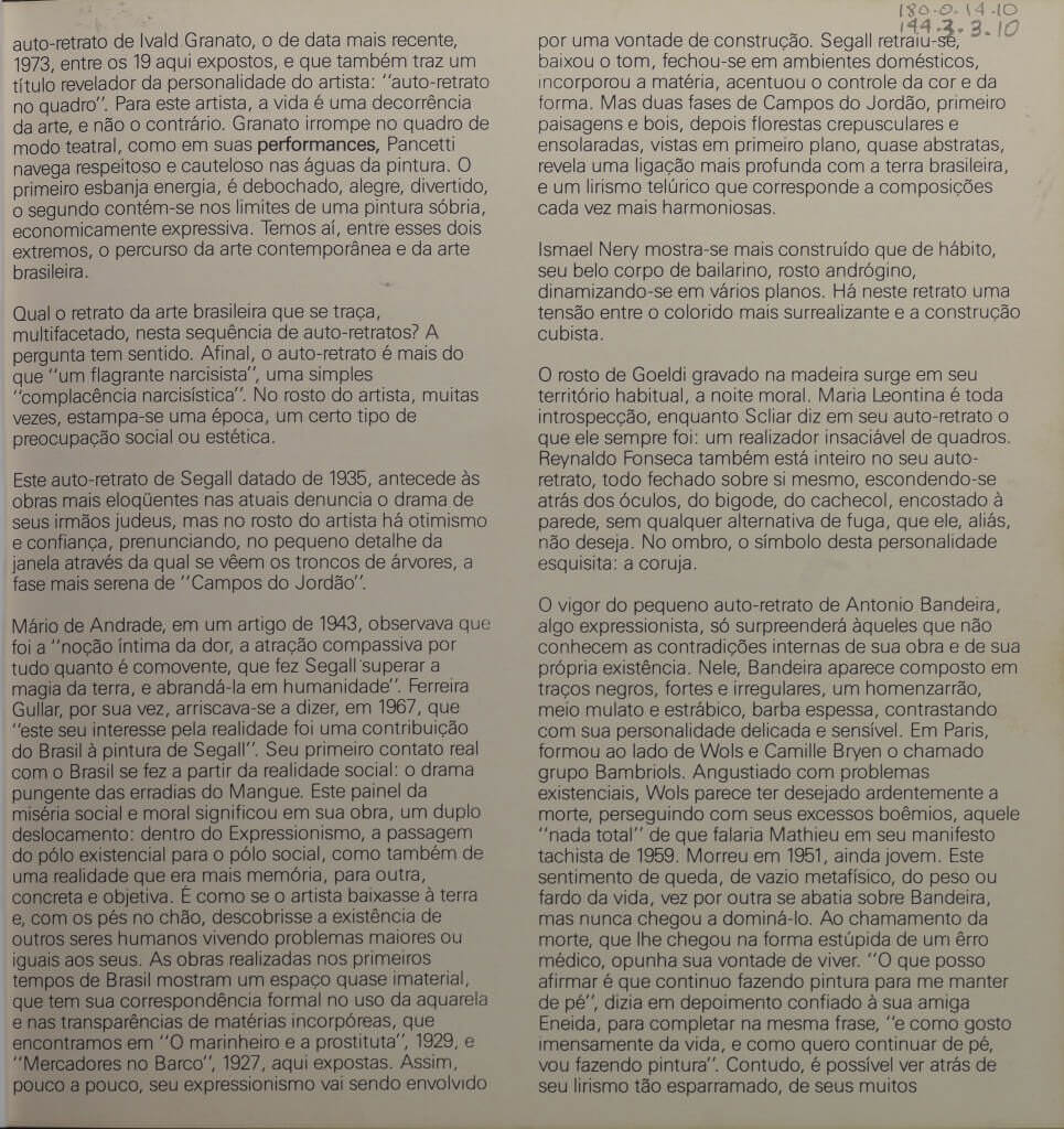 Catálogo da exposição "Retrato e auto-retrato da arte brasileira" realizada no período de maio a junho de 1984 no Museu de Arte Moderna de São Paulo, com 231 obras da coleção de Gilberto Chateubriand. Retrato e auto-retrato da arte brasileira contou com a curadoria de Frederico Morais.