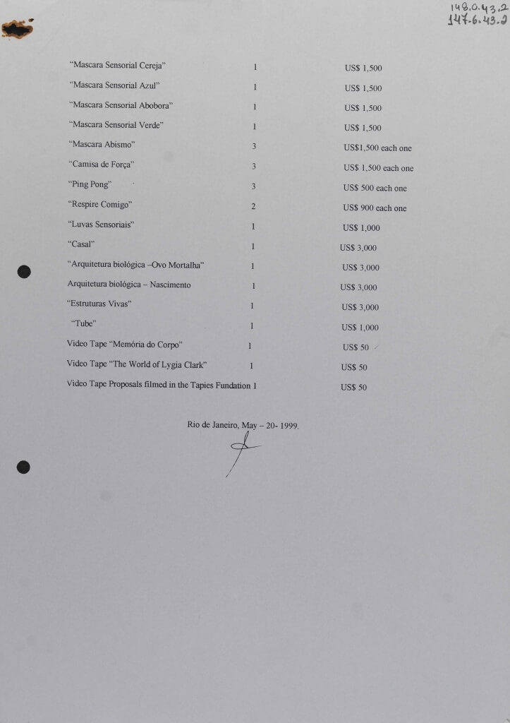 Lista de réplicas das obras de Lygia Clark para Exposição do MAM-SP.