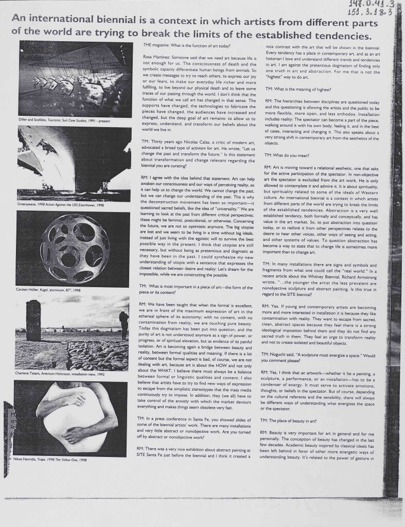 Periódico "The Magazine", do mês de Julho de 1999, sobre a exposição "SITE Santa Fe´s Third International Biennial: Looking for a Place".