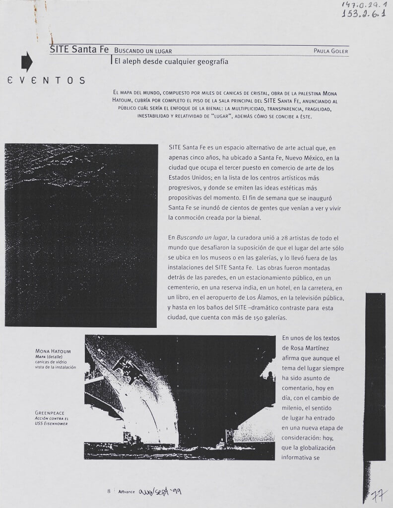 Artigo sobre a exposição "SITE Santa Fe´s Third International Biennial", realizada na cidade de Santa Fé/ Novo México-EUA.