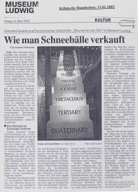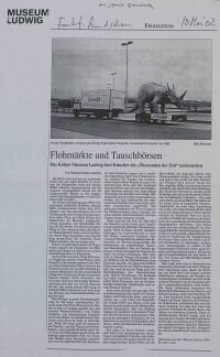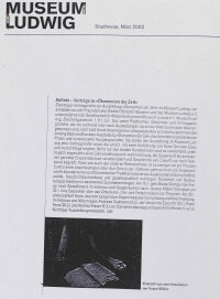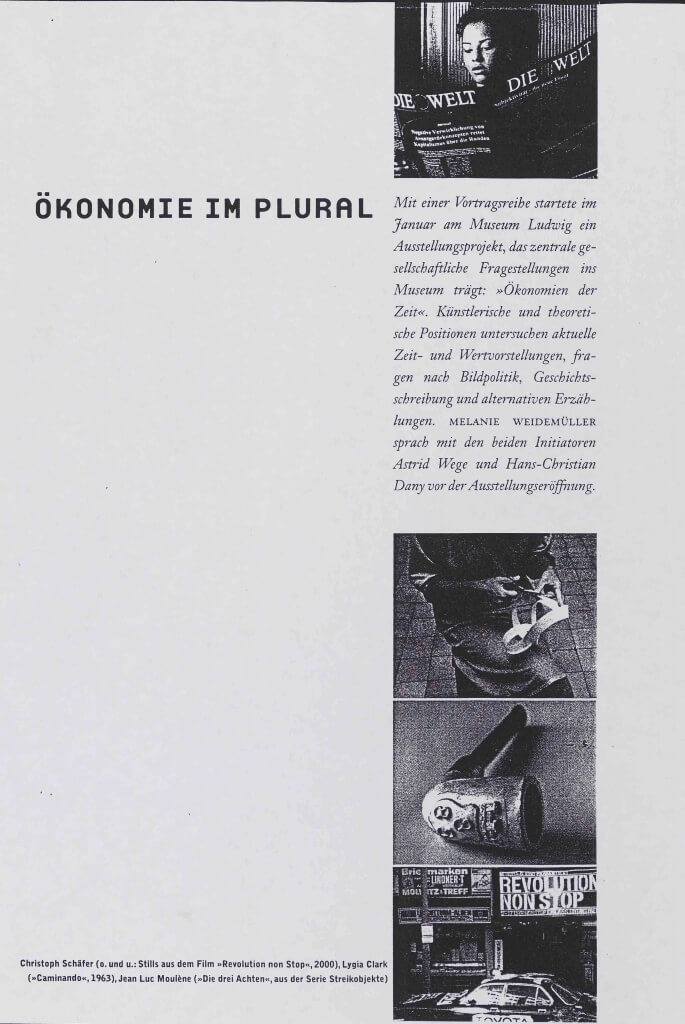Noticiário realizado para divulgação das exposições do Museum Ludwig. Junto aos documentos, consta informações dos participantes e suas obras apresentadas na exposição Ökonomien Der Zeit, realizada pela Akademie Der Künste, Berlim, em 2002, e reportagens de diversos jonais e revista sobre a exposição no periodo de 09 de nov./ 2002 - 12 de jan./2003. Lygia Clark foi representada na exposição com a obra "Caminhando", 1963.
