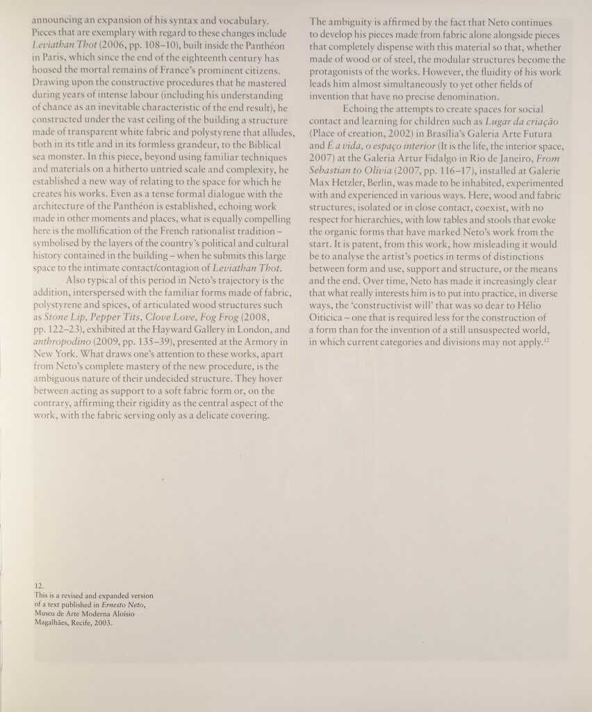 LAUSON, Cliff. In: Ernesto Neto: The Edges of The World. London: Hayward Pub. ; New York : Distributed in North America, Central America and South America by D.A.P, 2010. p. 11-18.