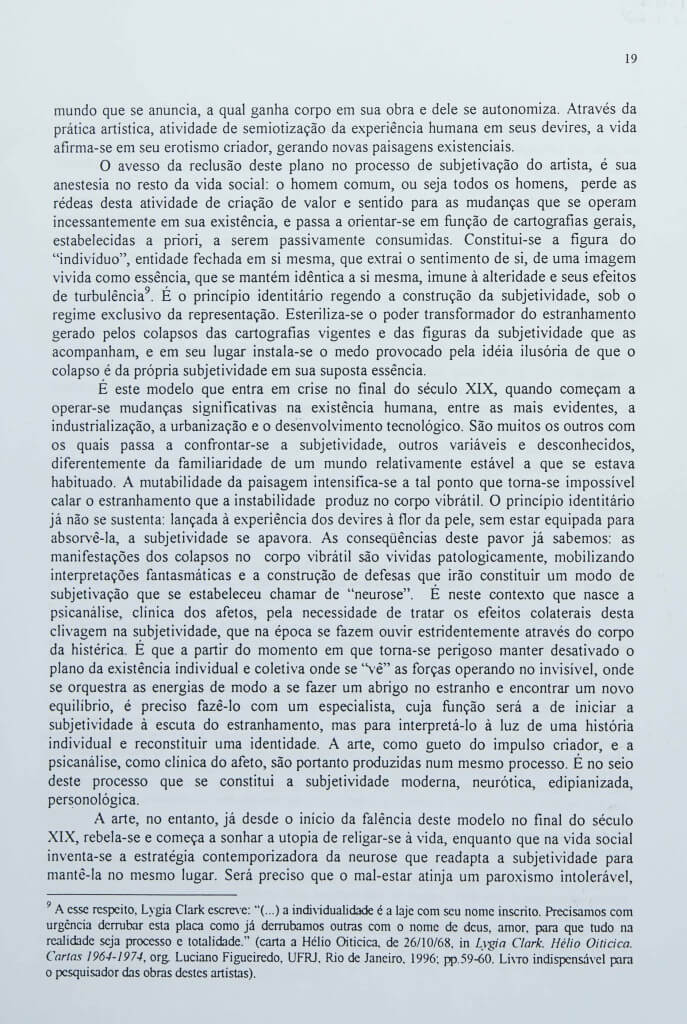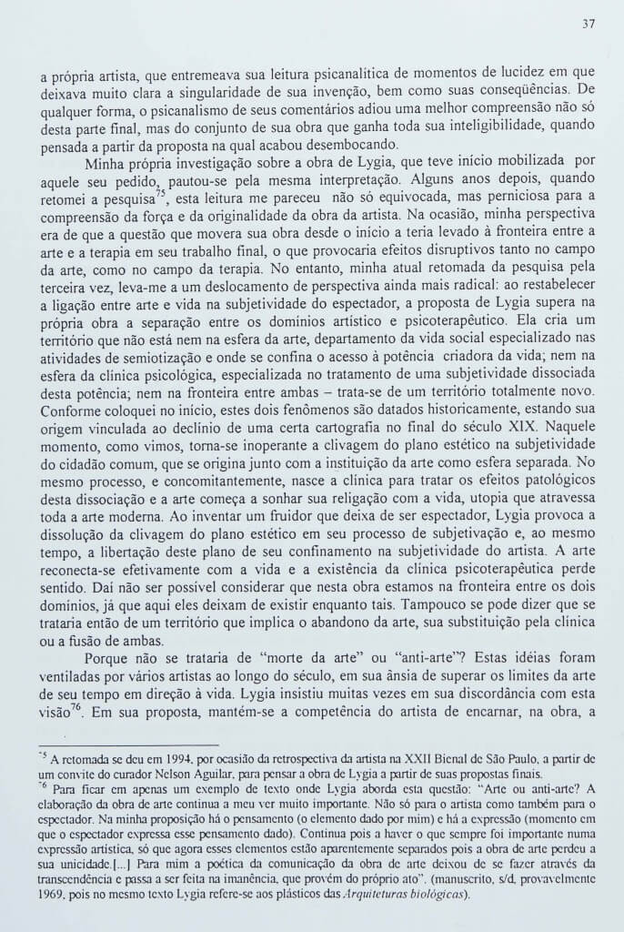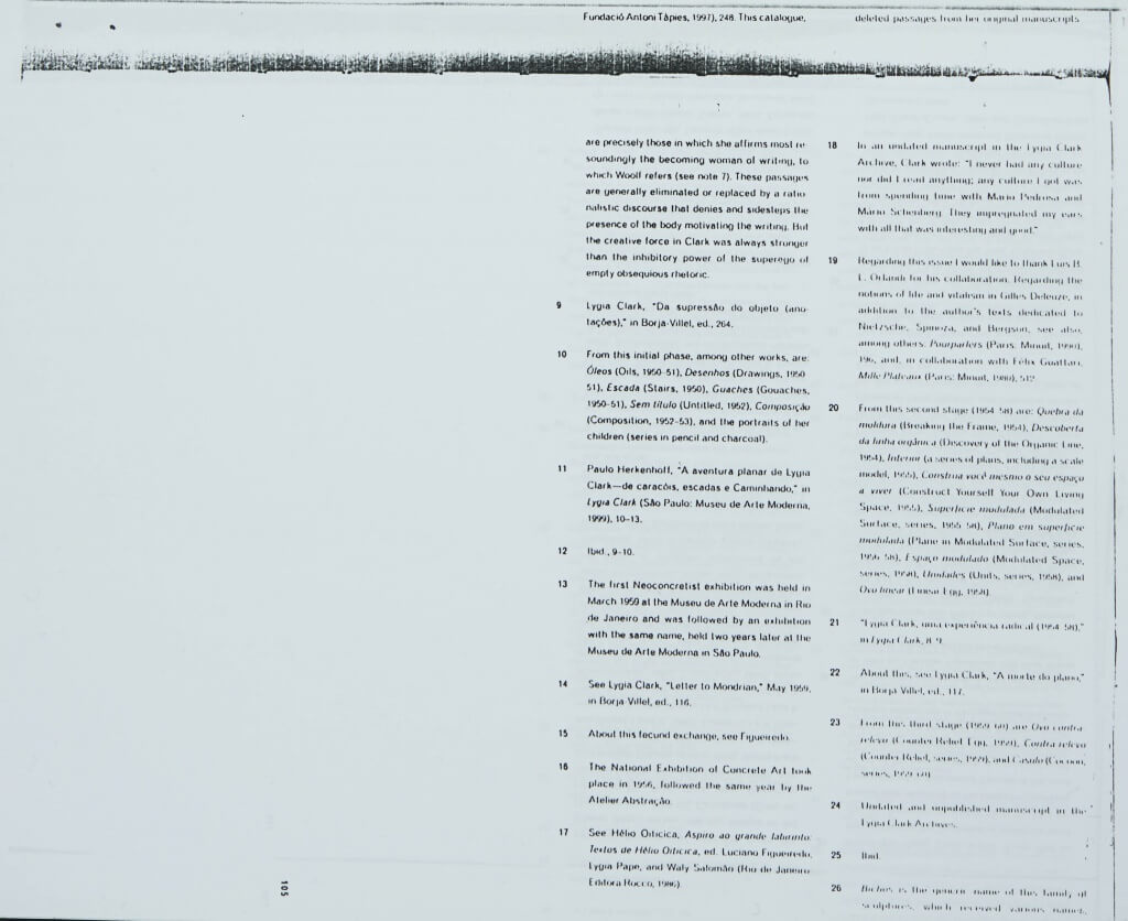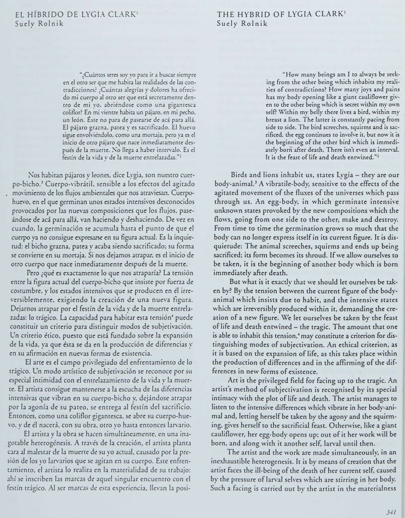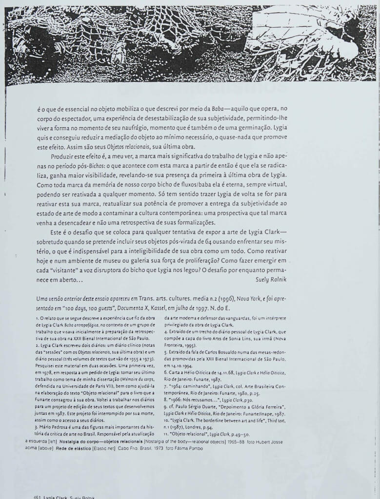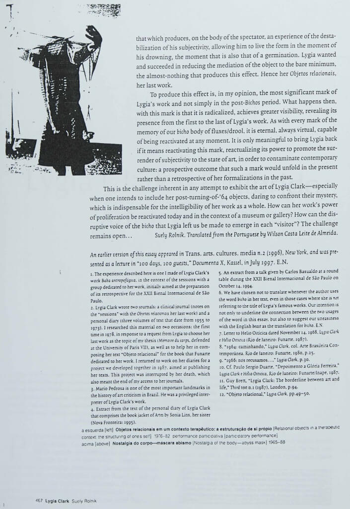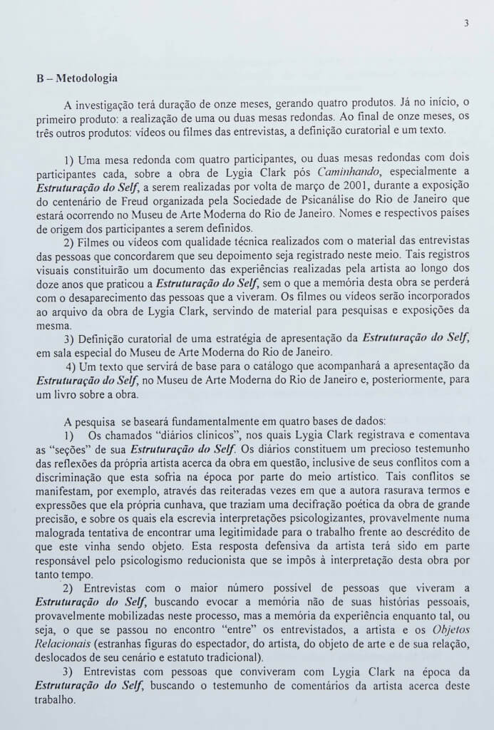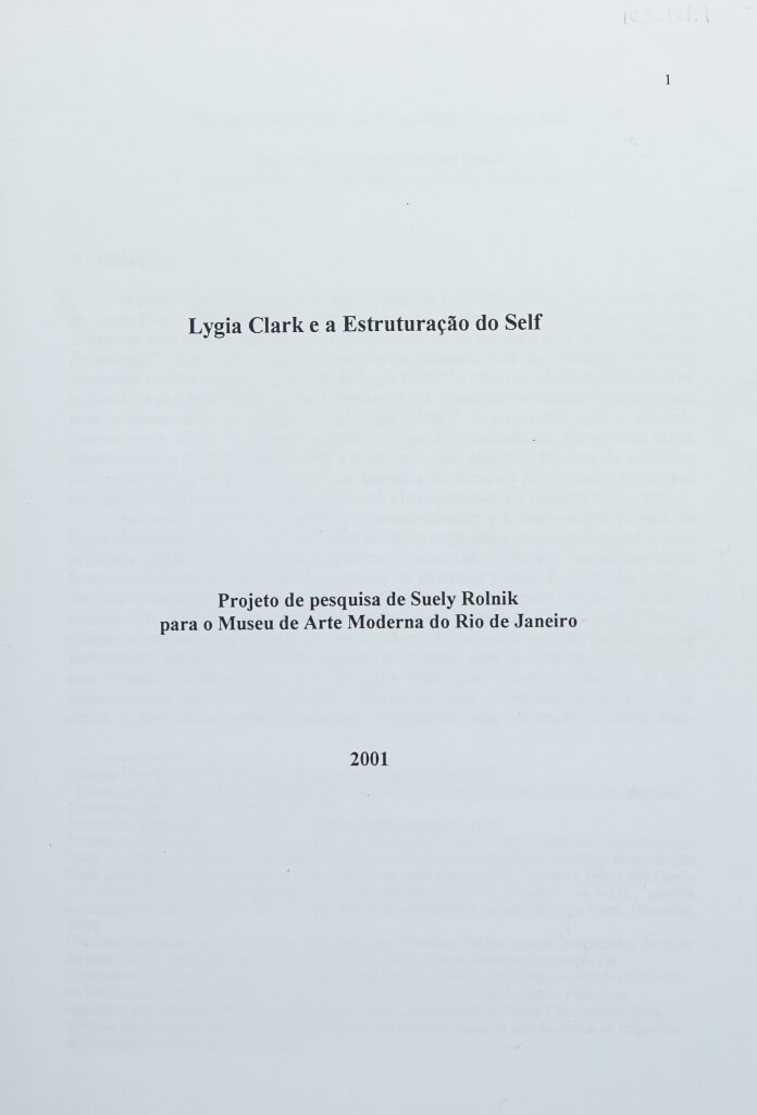 Projeto de pesquisa de Suely Rolnik para o Museu de Arte Moderna do Rio de Janeiro, sobre a ultima obra de Lygia Clark: Estruturação do Self.