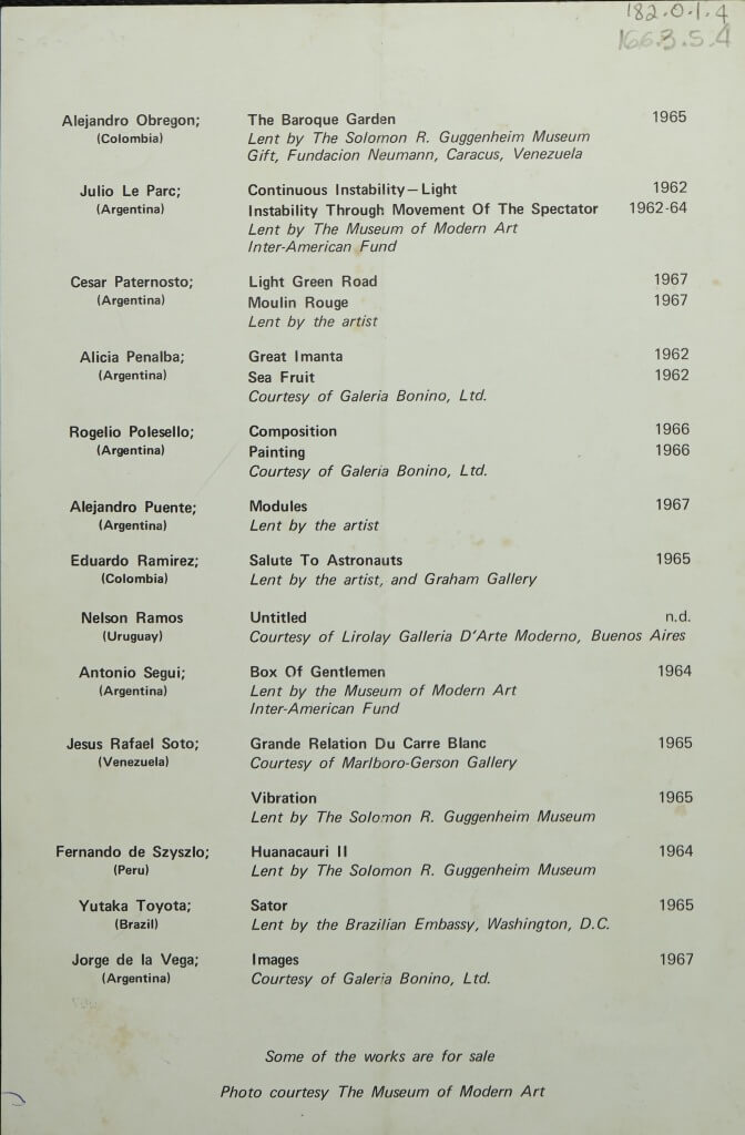 Catálogo da exposição “Contemporary Latin American Artists”, realizada pela Wilmington Society of the Fine Arts e apresentada no Delaware Arts Center, em 1968.
