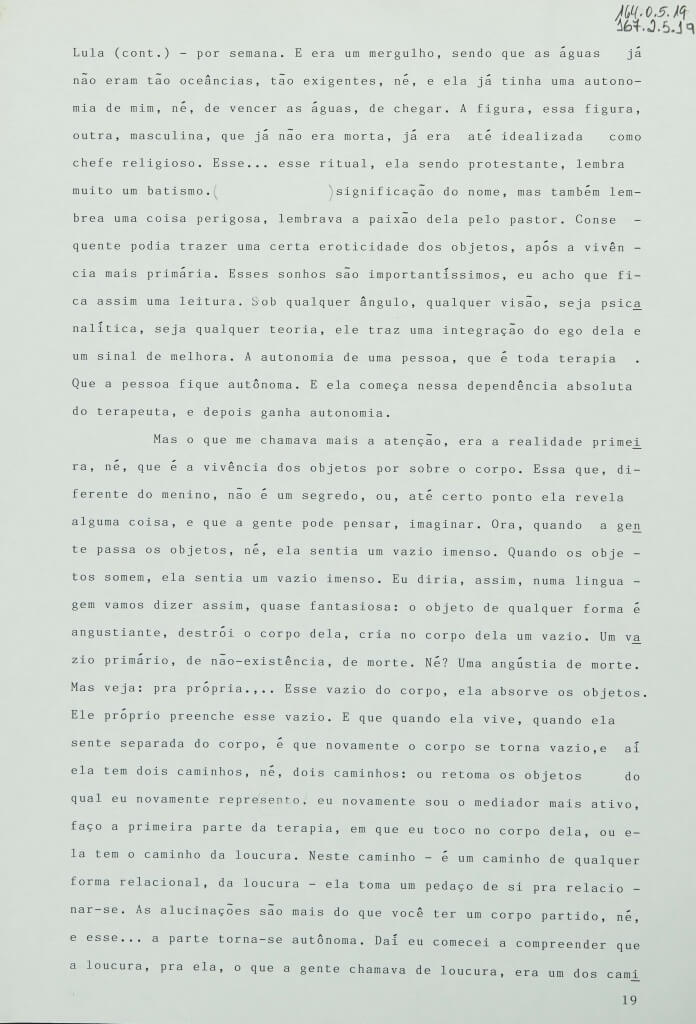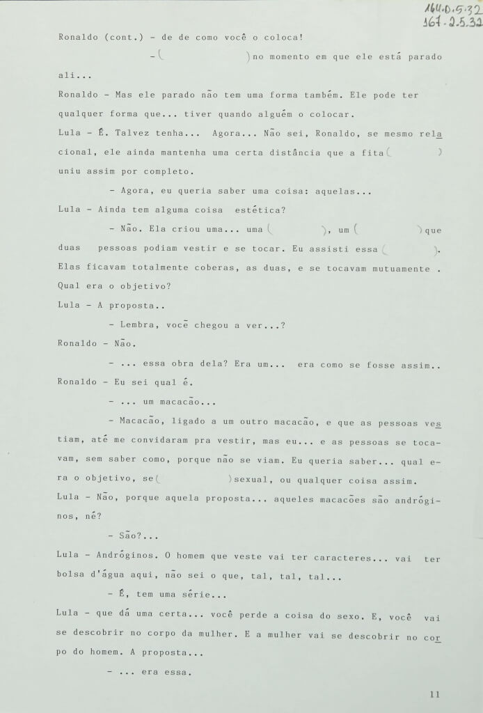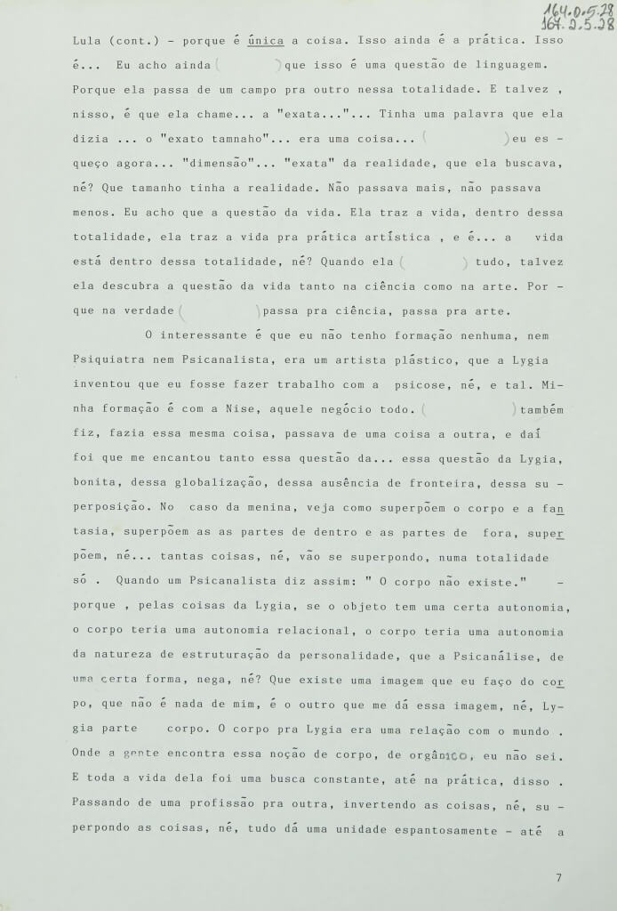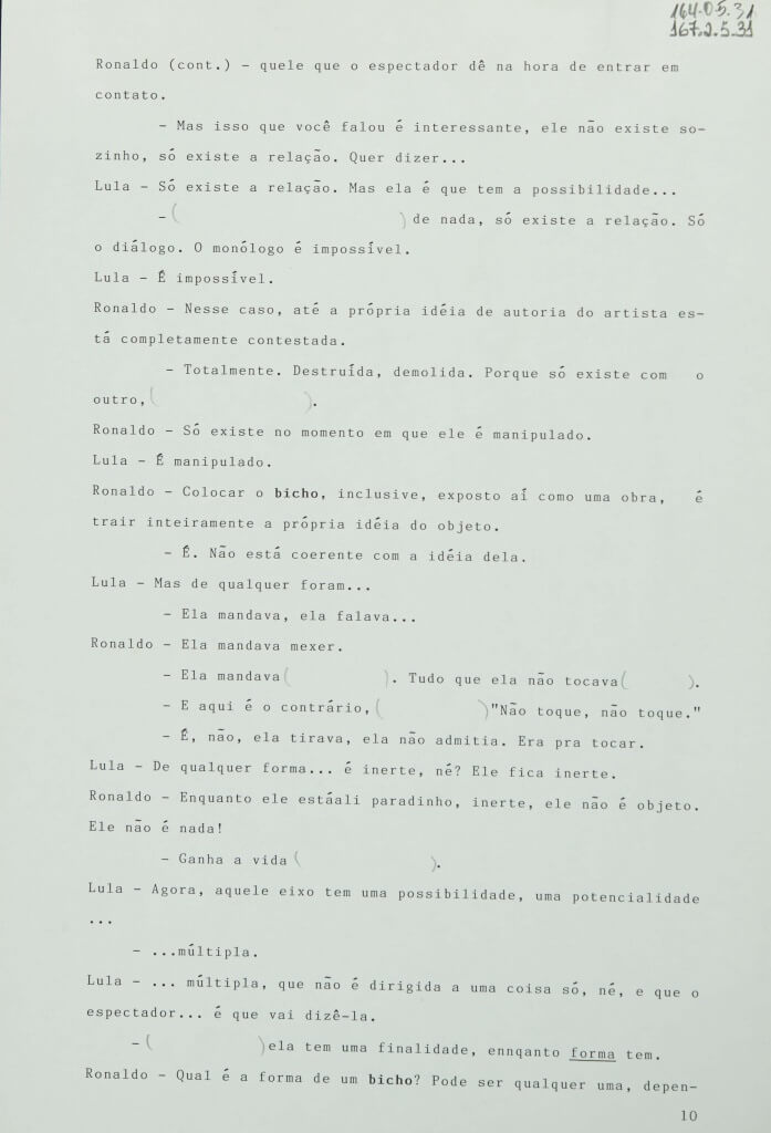 Entrevista captada a partir de seminário interno sobre Lygia Clark promovido pelo Museu de Arte Moderna do Rio de Janeiro, ministrado por Lula Wanderlei. Nele, Lula Wanderlei fala a respeito da evolução dos trabalhos de Lygia Clark a partir dos bichos e das pesquisas realizadas pela artista que culminaram na concepção de objetos de arte com um caráter terapêutico.