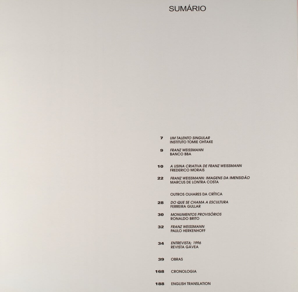 Livro sobre o artista Franz Weissmann, contém cronologia de sua vida aliado a sua produção artística. Além de entrevistas e compilação de textos sobre o assunto