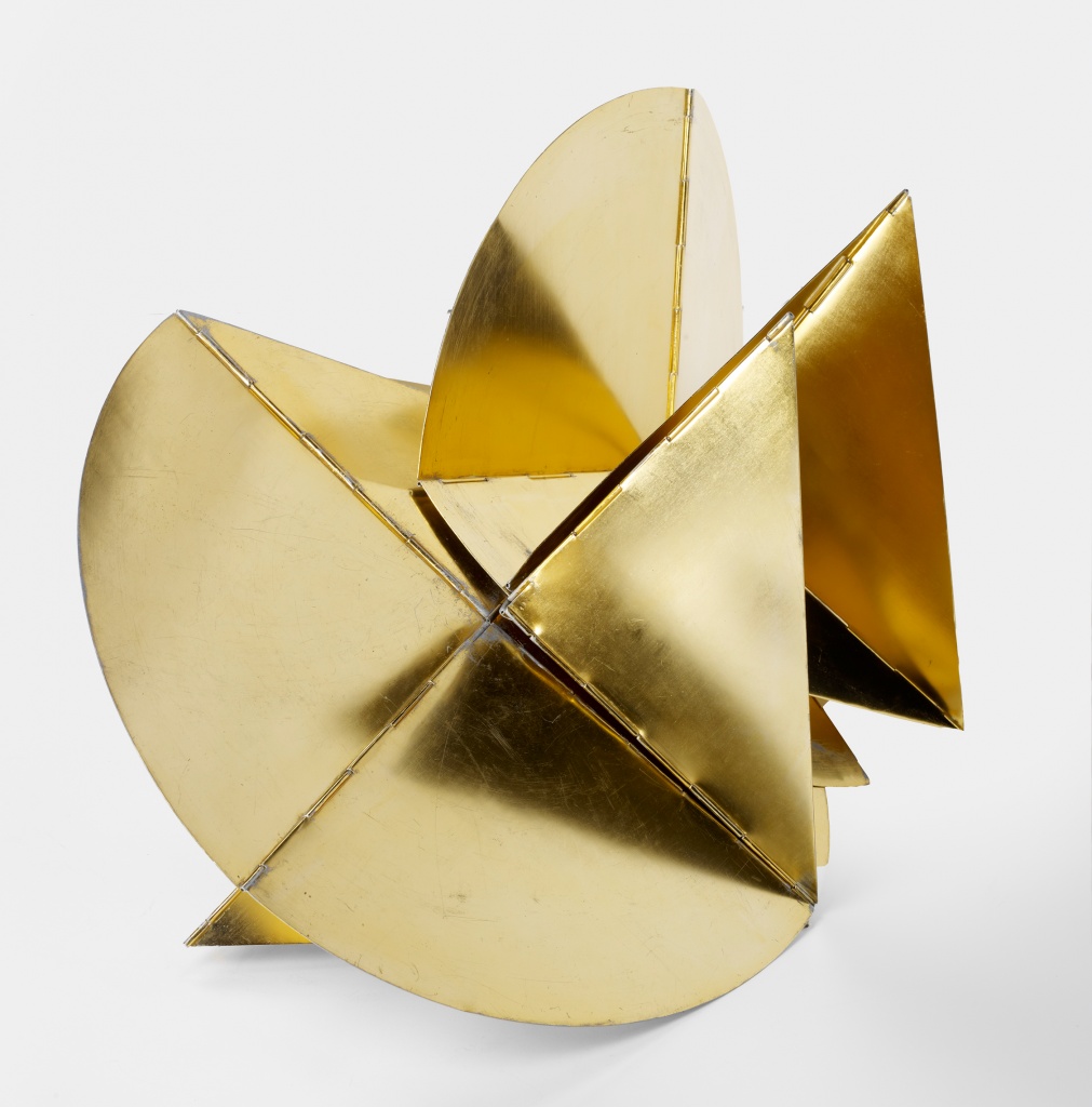 24 plates (8 quadrants and 16 right-angled triangular plates) each connected along two sides with hinges, with an internal blunt ended metal pin within. In order to open out construction, there are 2"centres", each with 12 plates (there a 4 quadrants sandwiched between 4 triangles on either side to each half) which are rotated out in an anti-clocwise direction from these centres and lifted in order for the object to take on an infinite variety of shapes. Plates have sides 30cms long, with hinges of 5cms and 2.5cms. The hinges at the corners are 2.5cm, and the others in between are are 5cm long.