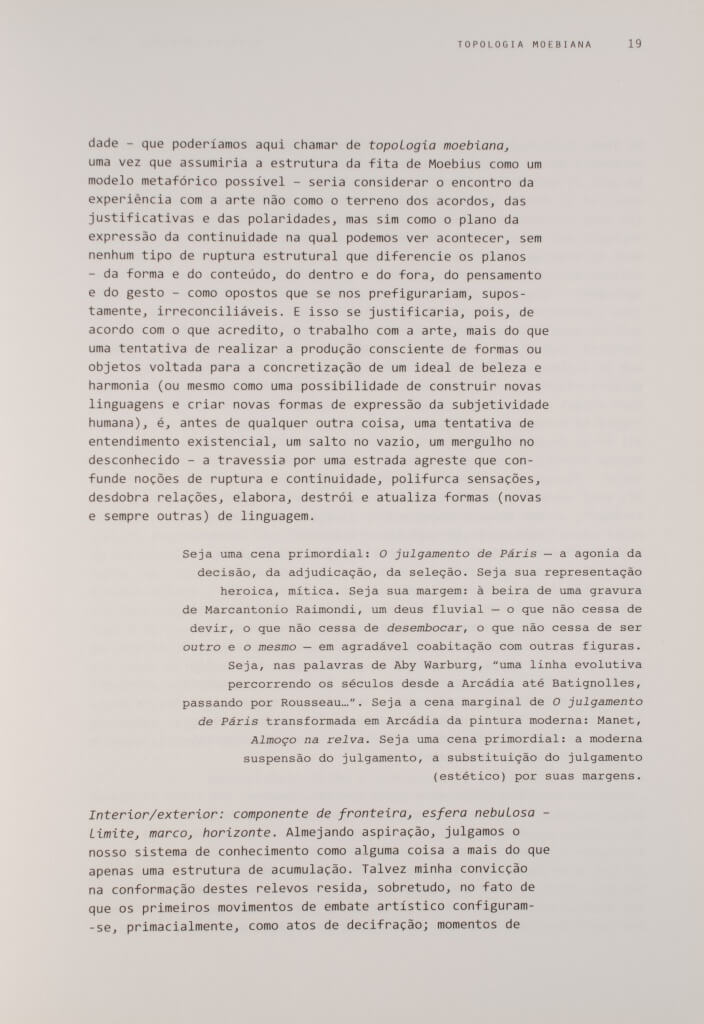 SEVERO, André; ORAMAS, Luis Pérez. Topologia moebiana/ Moebian topology. In:SEVERO, André; ORAMAS, Luis Pérez. Dentro/fora / Inside/outside. São Paulo: Fundação Bienal de São Paulo, 2013. Catálogo