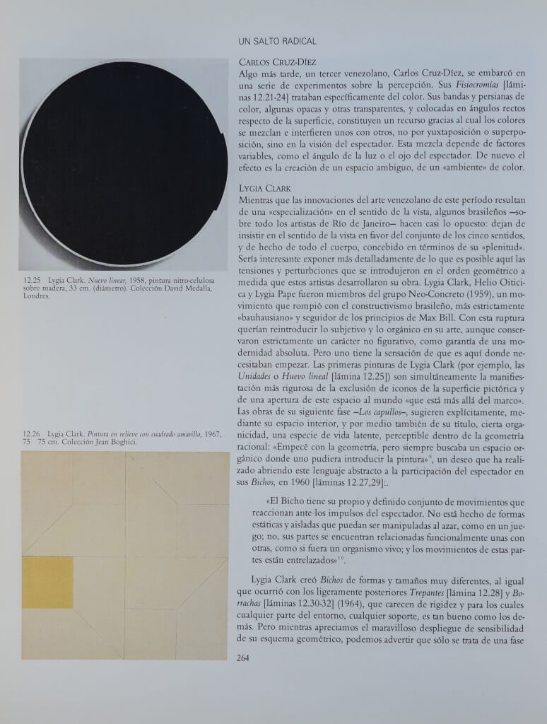 Catálogo da exposição Arte en Iberoamérica, 1820-1980, Palacio de Velázquez, 14 de dez. de 1989 a 04 de Mar. de 1990. Obras de Lygia Clark expostas: Bicho, 1962; Trepante, 1965; O detro é o fora; Ovo linear, 1958; Pintura em relevo com quadrado amarelo, 1967; Obra mole, 1964.