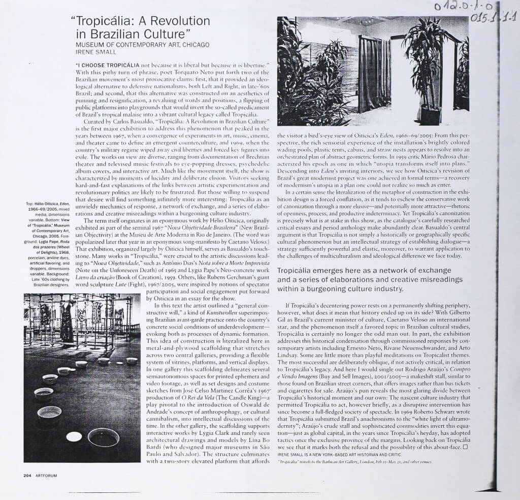 Texto sobre a Tropicália, com o depoimento e citação de alguns artistas do movimento, abordando sua inserção no mesmo.