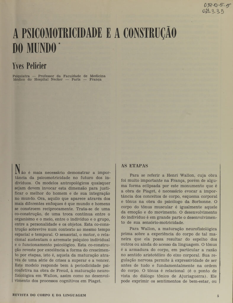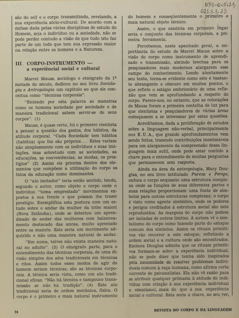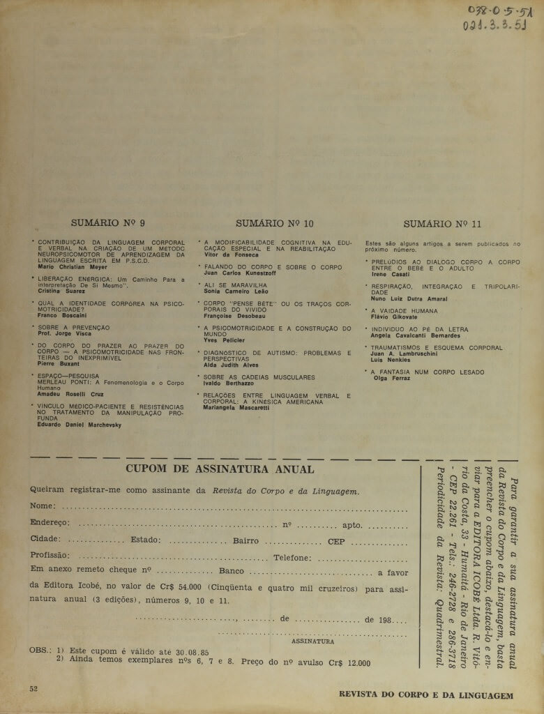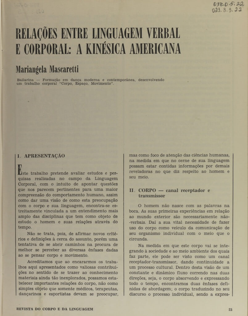 Documento de leitura pessoal de Lygia Clark,, Revista do Corpo e da Linguagem, Jul.1985, vol. IV, nº 10 - Rio de Janeiro, que trata sobre o corpo e a linguagem. Traz aspectos sobre a psicologia, psiquiatria, fonaudiologia entre outros.