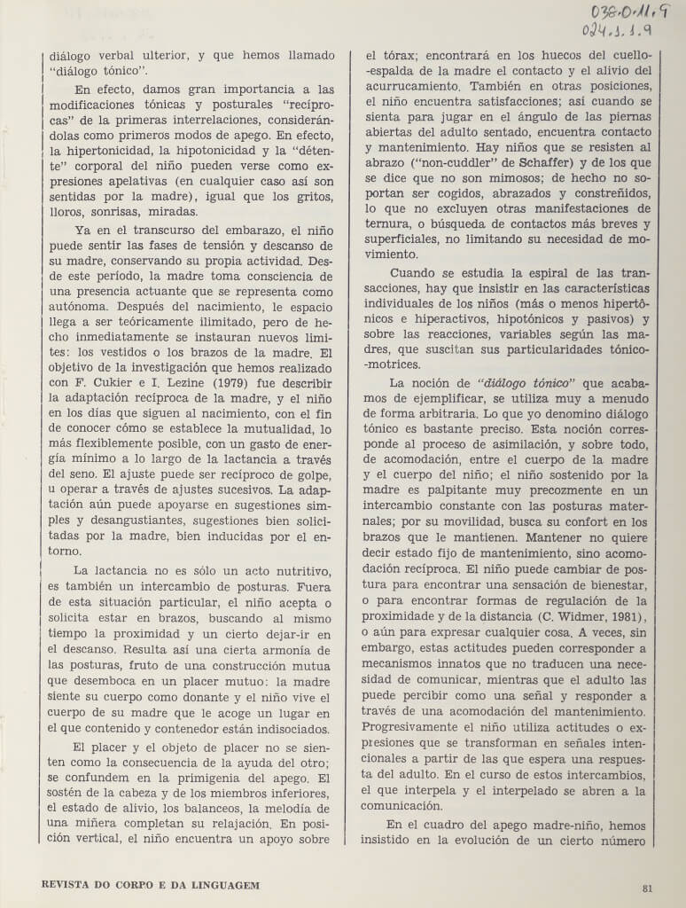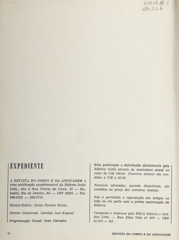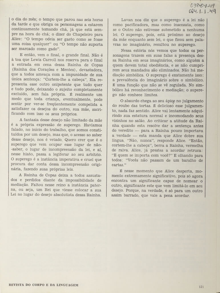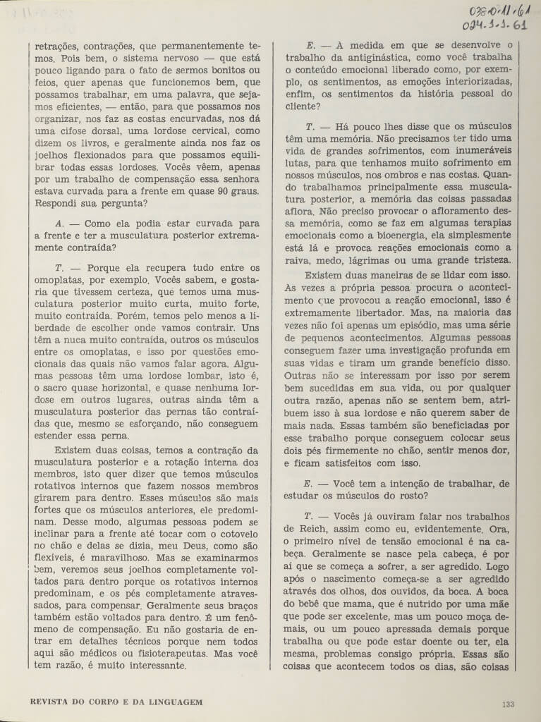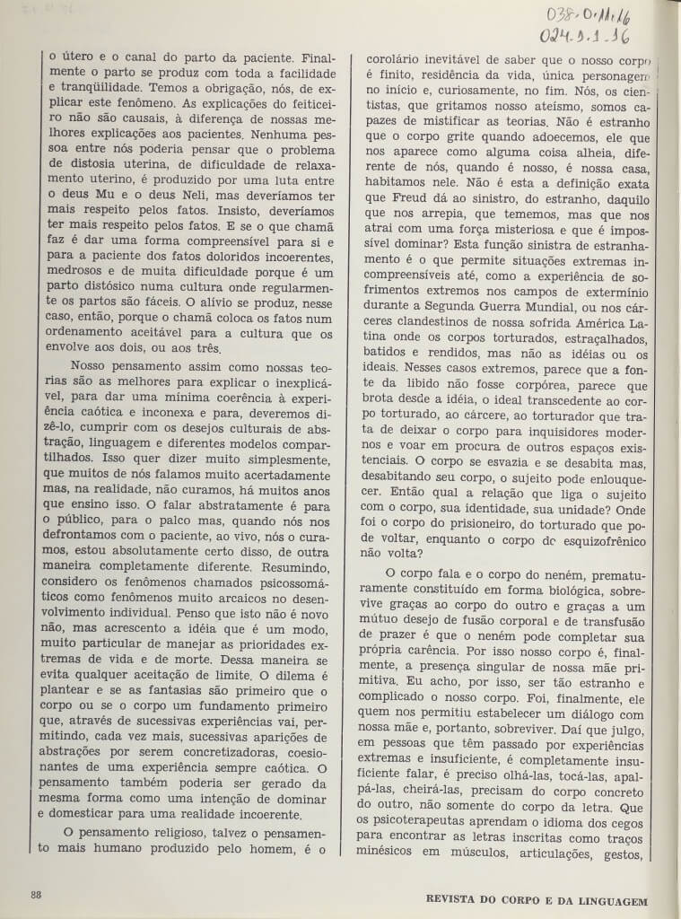Documento de leitura pessoal de Lygia Clark, revista "Do corpo e da Linguagem", publicada em março de 1986, vol. IV, nº 12, Rio de Janeiro - Brasil.