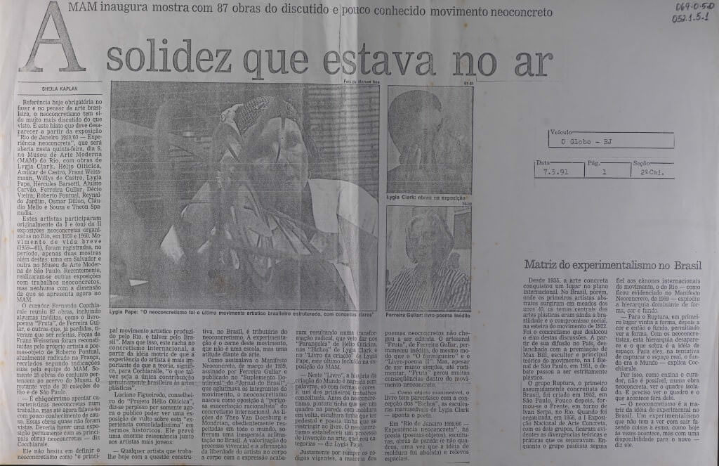 Artigo publicado no jornal O Globo em maio de 1991 sobre a exposição “Rio de Janeiro 1959/60 – Experiencia Neoconcreta” no Museu de Arte Moderna (MAM) do Rio de Janeiro.